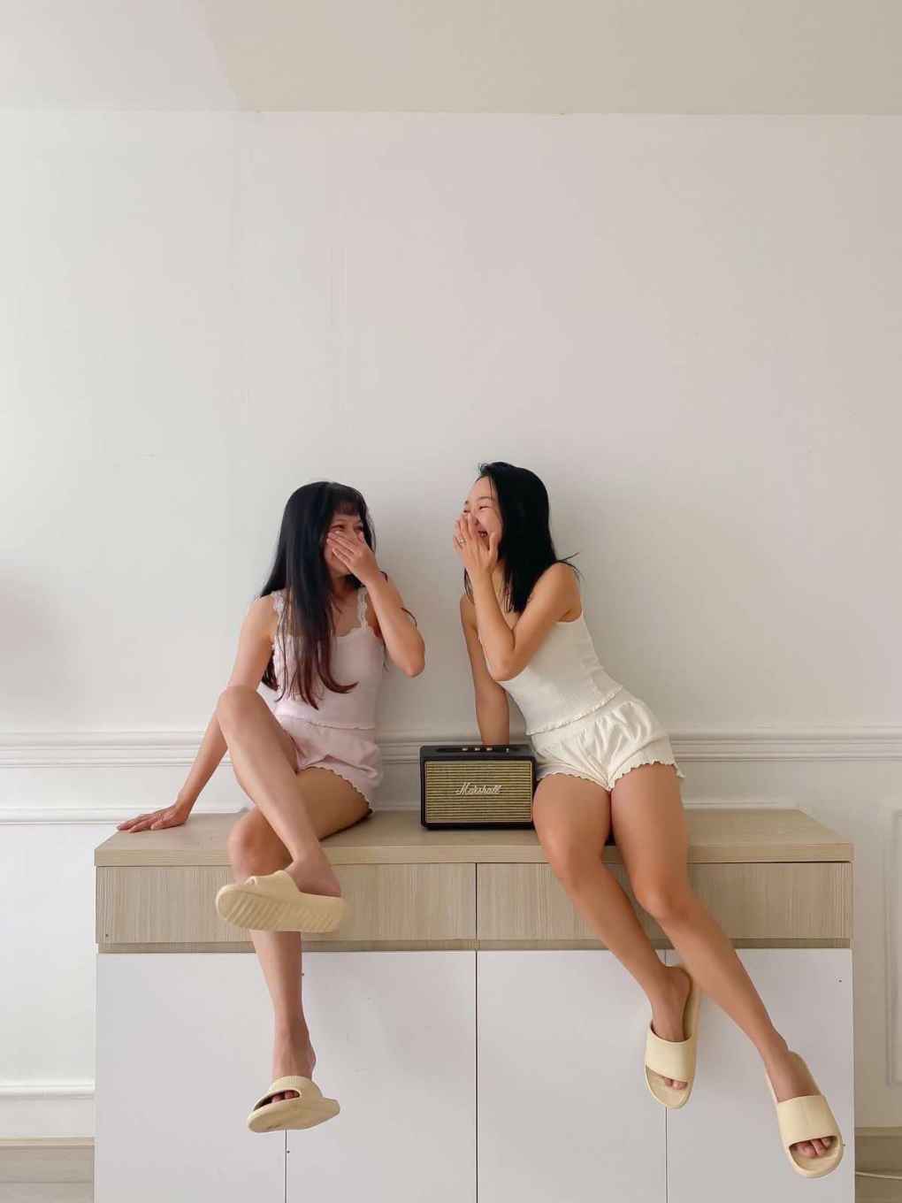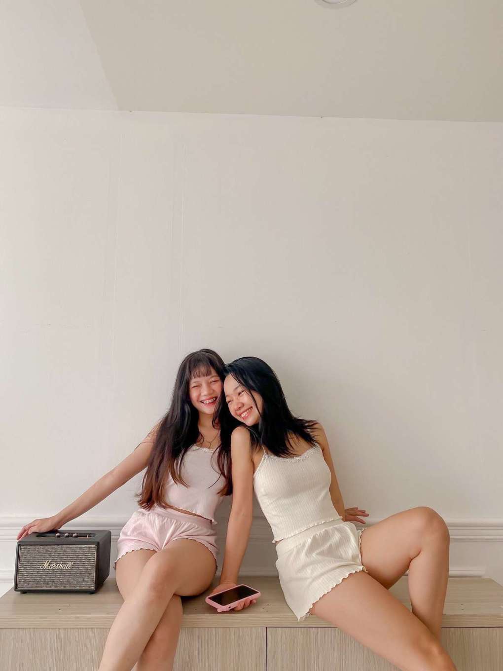 - Chụp ảnh đồ ngủ cùng nhỏ bạn: Hai bạn có thể sắm set đồ ngủ giống nhau nhưng khác màu sắc để có những bộ ảnh trêu đùa ngây thơ và hồn nhiên. Với chủ đề này, bạn sẽ không cần lo lắng tìm kiếm không gian hay phụ kiện quá nhiều, chỉ cần đảm bảo ánh sáng và backround gọn gàng nhé.
